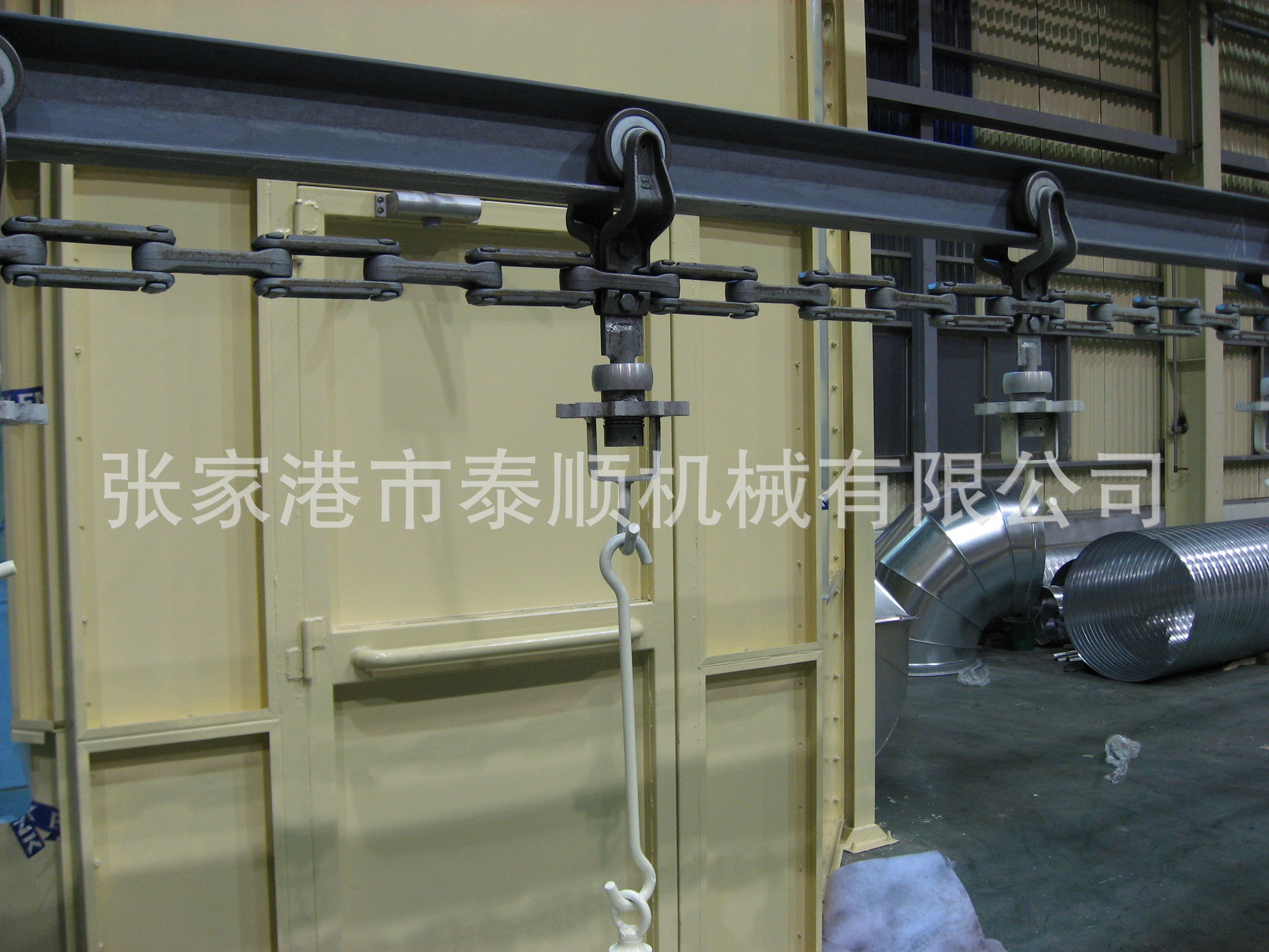 XT系列重型悬挂输送机是现有普通悬挂输送机中较为广泛应用的产品,该机具有高度的机械化与自动化,主要使用于衔接工序繁多、节拍很短、工艺方法相对稳定的生产过程。该机具有良好的空间性,能在水平面和垂直面内作任意回转,根据工艺流程需要,经合理的工艺线路设计,可穿越较长路线,绕过障碍,将工件按预定的线路运往指定地点,达到搬运物件的生产目的,从而将各个单一的独立的专业生产环节配套成自动化流水线,提高生产率和产品质量,强化管理水平。另外该机可使工件连续不断地运经高温烘道、有毒气体区、喷粉室、浸漆前处理、冷冻室等,完成人工难以操作的生产过程。从而改善工人劳动条件,此外,该机还具有动力消耗较少,噪音低,运行平稳、易操作、使用安全等优点。